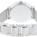 Boîtier rond en acier inoxydable bicolore argent et doré (≈34-38 mm) avec cadran argenté. Bracelet maillé bicolore avec maillons ajustables et fermoir à clip. Mouvement à quartz. Étanchéité 3 ATM.